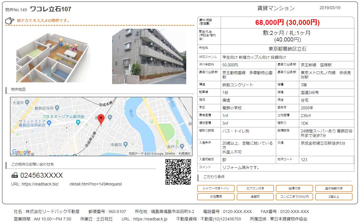 ウェブで物件の全てを伝えることを目的に、物件情報、物件画像、周辺情報を余すこと無く掲載し、ご契約までスピーディに進めるようになっています。