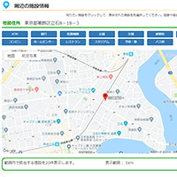 物件毎に周辺施設を表示。表示するカテゴリは自由に指定出来ます。 ファミリーは、公園、学校、病院の近所、単身者なら、コンビニ、駅、飲食店が近所にあった方がいいでしょう。 物件からの距離や、徒歩何分かかるのか、実際の径路まで提示します。 その他、最寄り駅や現在地からの径路表示も出せるため、お客様一人でも道に迷いません! |